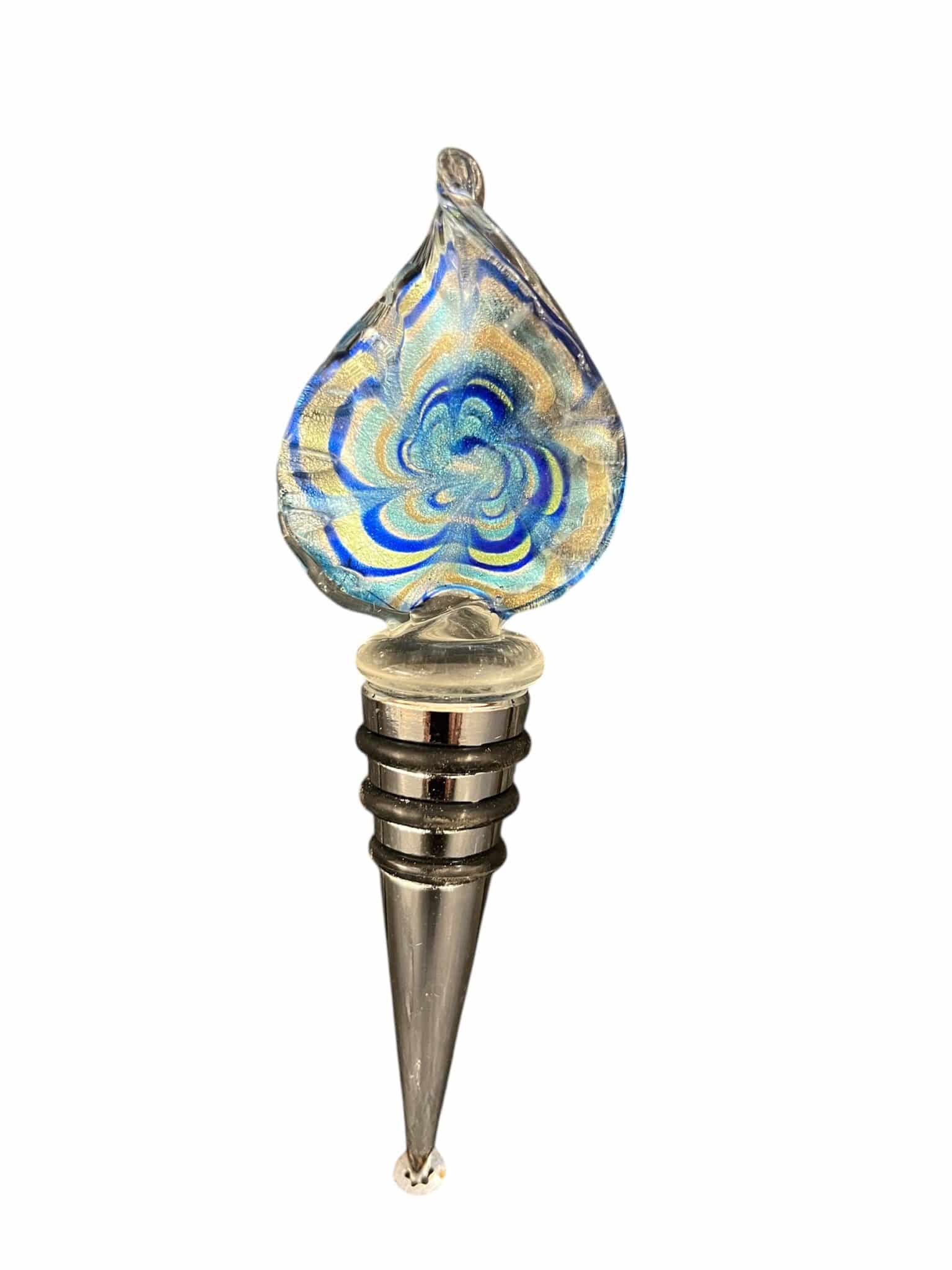 Flaschenverschließer aus buntem Weichglas mit Metallkorpus und eingearbeiteten Silikonringen zum luftdichten Verschließen