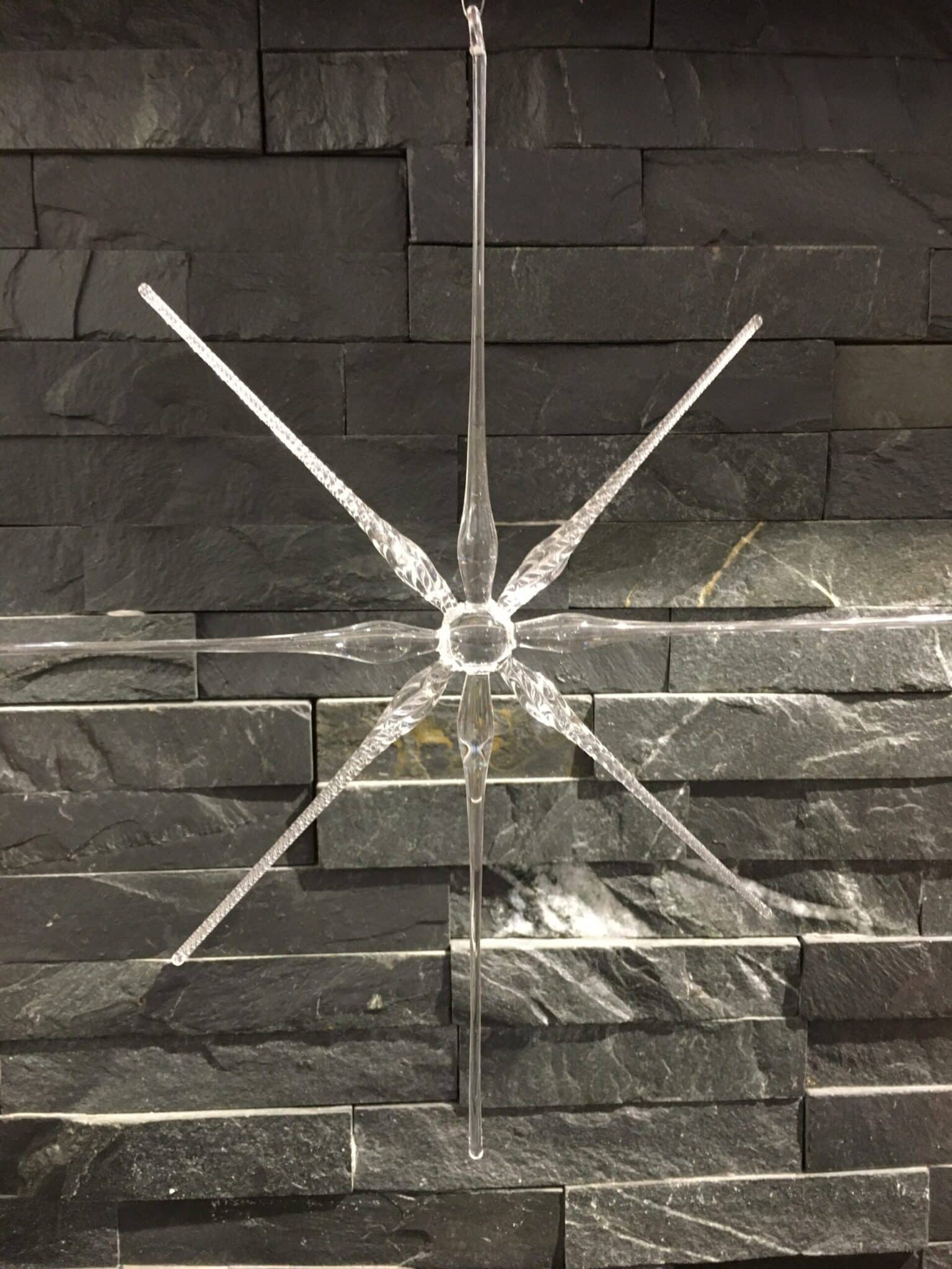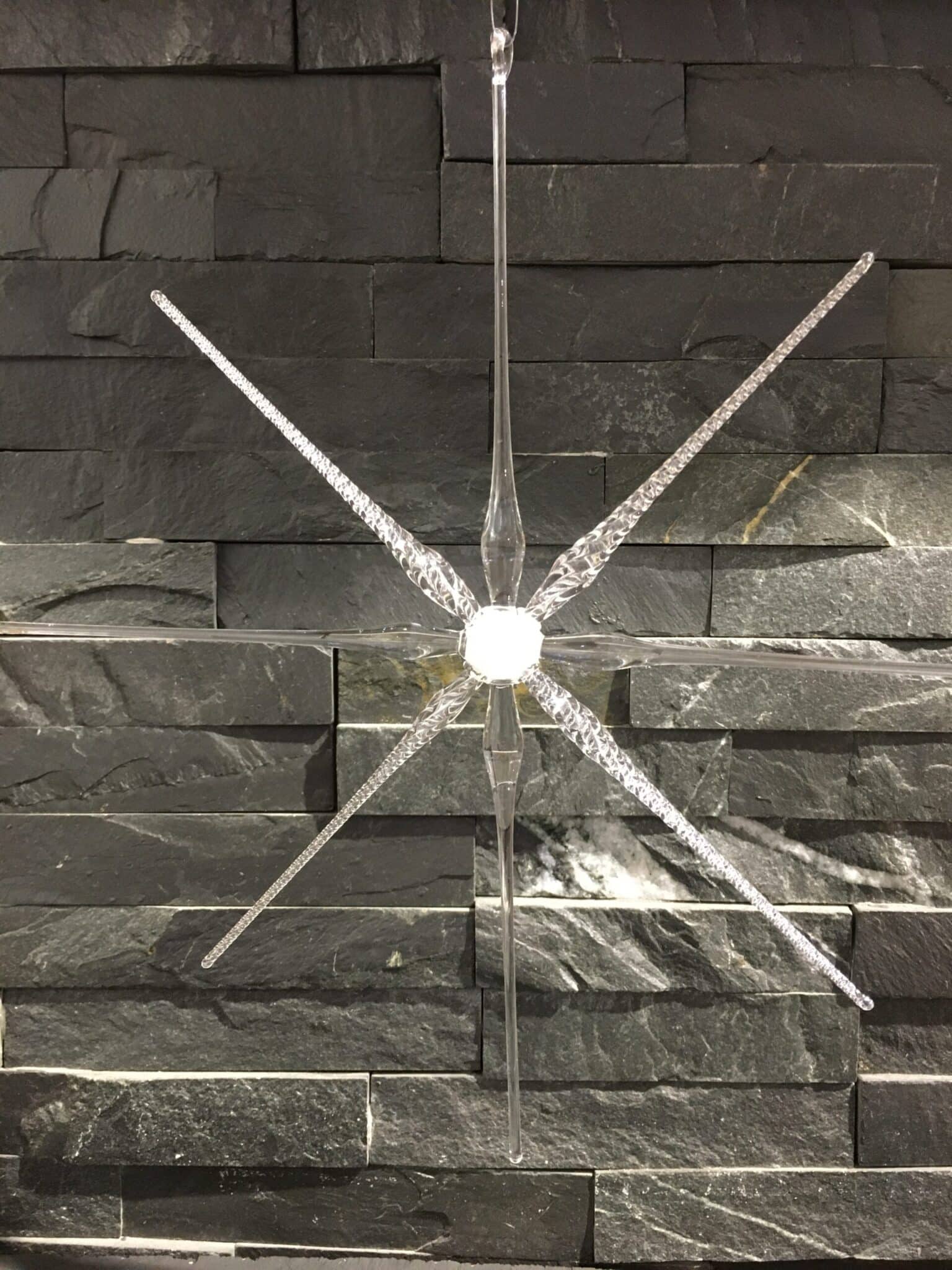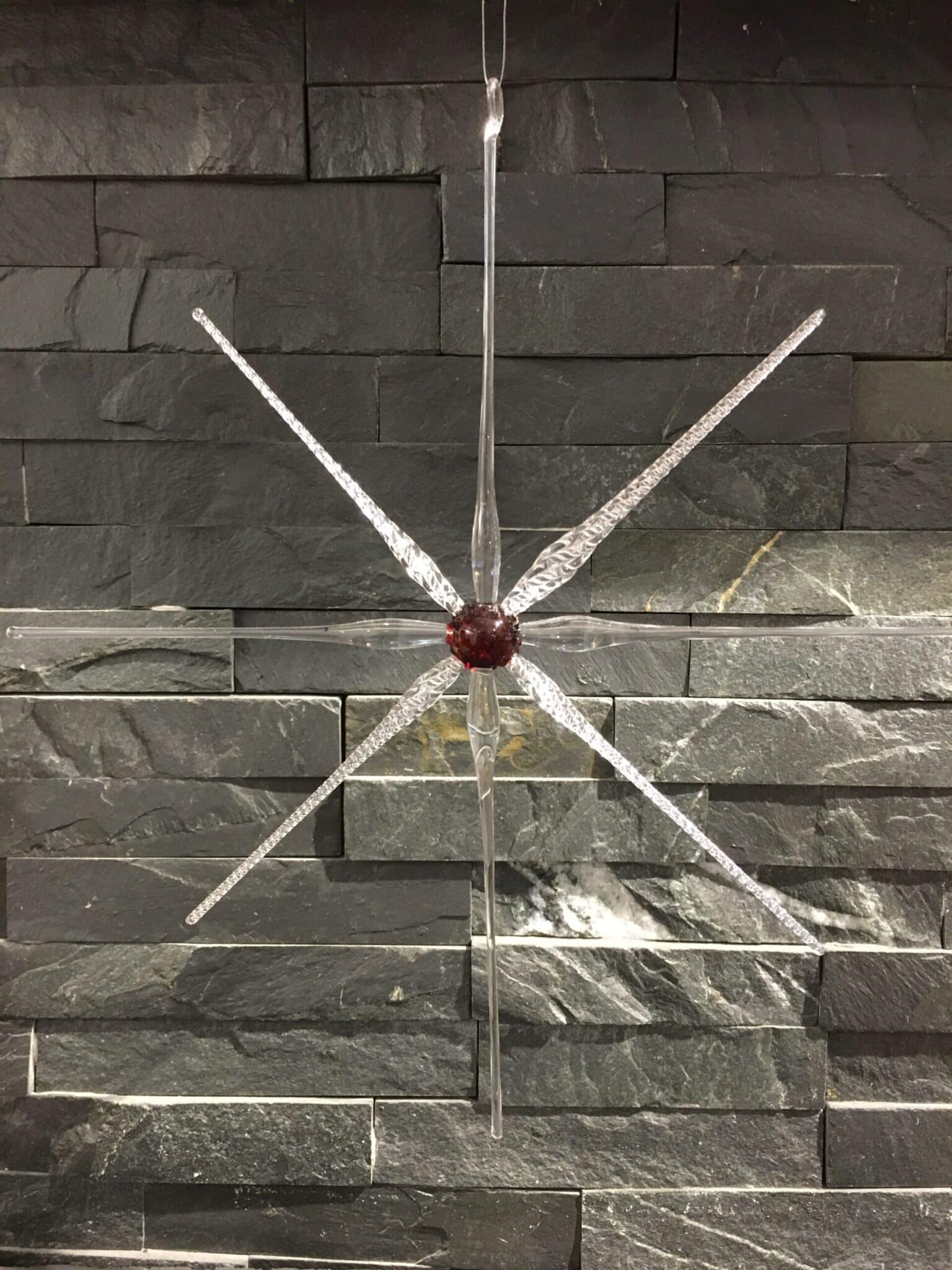Mundgeblasener Kristallstern aus Borosilikatglas zum Aufhängen, bestehend aus einem runden farbigen Glaselement als Mittelpunkt und klaren und gedrehten Sternspitzen