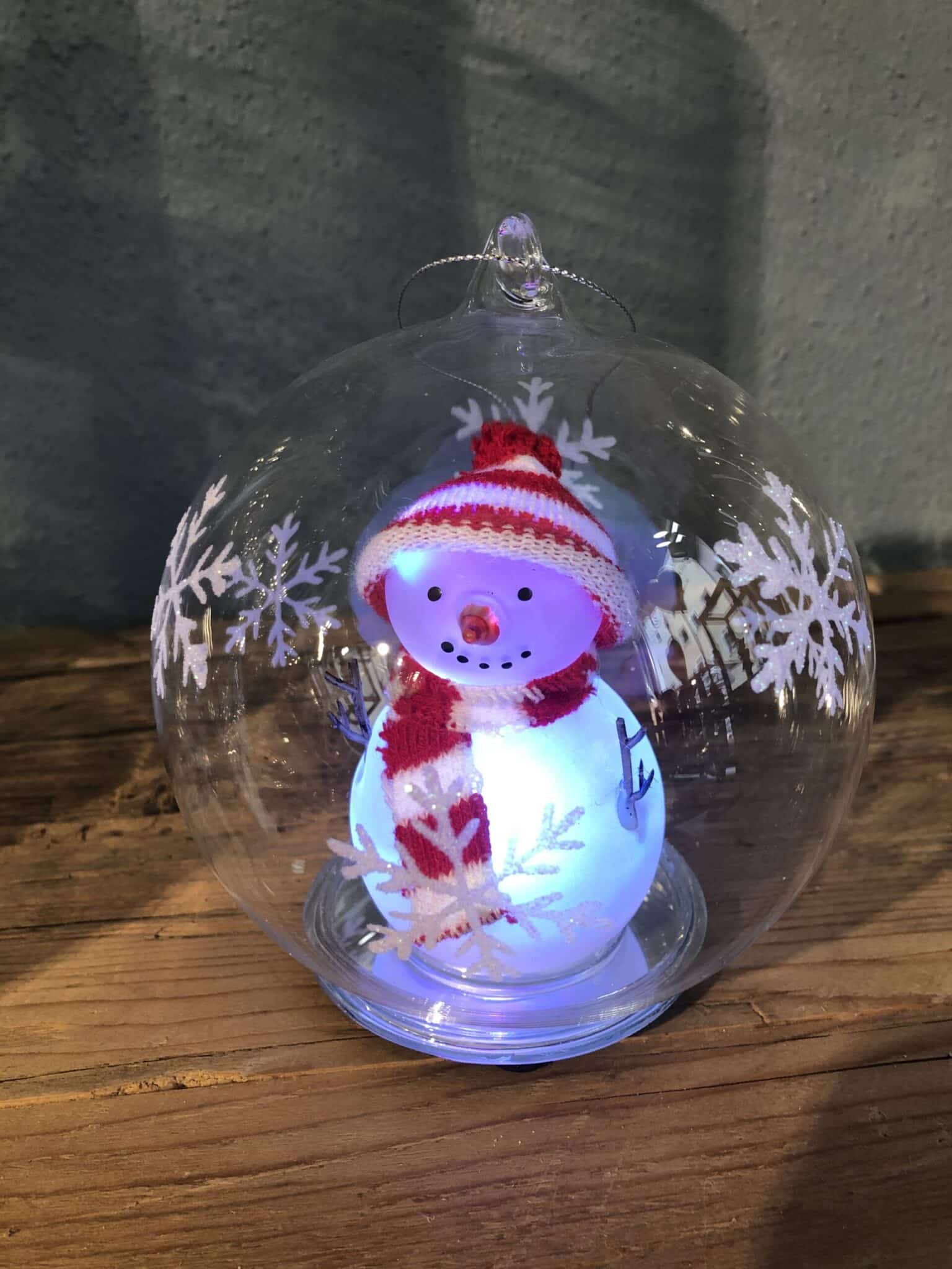 Glaskugel mit Schneemann LED Licht wechselt die Farbe.